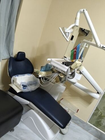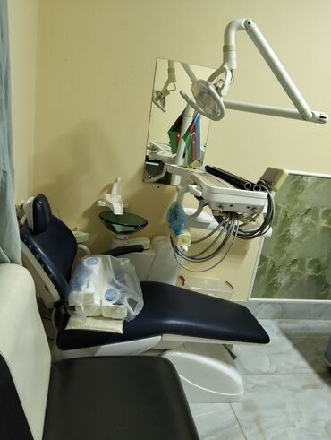 - Tənzimlənən elektrikli stomatoloji kreslo: başlıq və arxalıq bucağı rahat idarə olunur, ayaq hissəsi uzana bilir. Tünd göy rəngli ortopedik oturacaq.