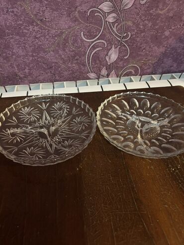Şüşə süfrə boşqabları dəsti - 2 ədəd iri ölçülü şüşə servis boşqabı - Material: qalın, şəffaf şüşə - Dizayn: mərkəzdə ulduzvari kəsim, çevrəsində rombvari relyefli naxış; kənarlarda incə çiçək mot...Giriş•Qeydiyyat