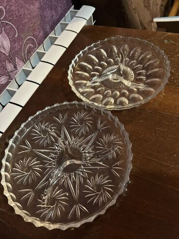 Şüşə süfrə boşqabları dəsti - 2 ədəd iri ölçülü şüşə servis boşqabı - Material: qalın, şəffaf şüşə - Dizayn: mərkəzdə ulduzvari kəsim, çevrəsində rombvari relyefli naxış; kənarlarda incə çiçək mot...