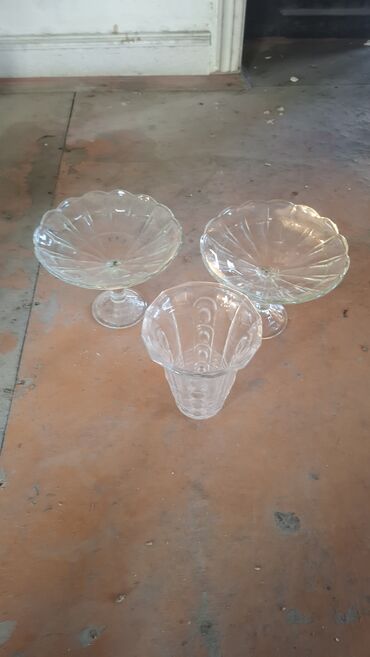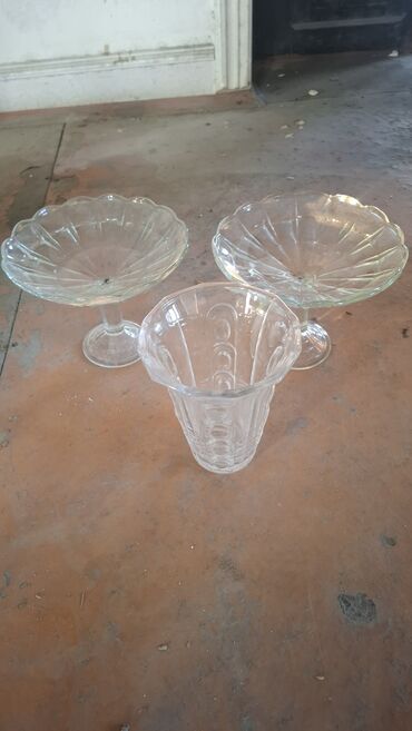 - 3 ədəd şüşə məmulatı: 2 ədəd ayaqlı desert/konfet qabı və 1 ədəd şüşə vaza