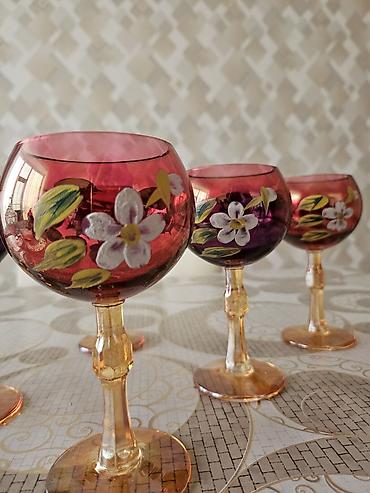 Qırmızı şüşədən bəzədilmiş likör/qrappa bakal dəsti - Sayı: 4 ədəd - Material: şüşə - Rəng və işləmə: üst hissəsi dərin qırmızı tonlu, ətrafında qızılı ornamentlə (gül və yarpaq motivləri) əllə iş...