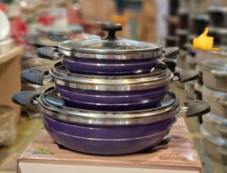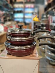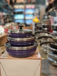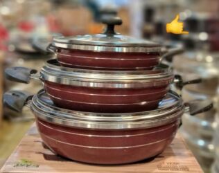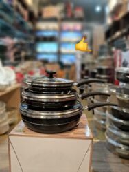 Dəstdə 3 ədəd dərin tava/qazan (kiçik, orta, böyük ölçülər) və hər birinə uyğun şüşə qapaq daxildir. Günlük istifadə və bol porsiyalı yeməklər üçün praktiki seçim. 1 year guarantee yazısı qablaşdırmada göstərilib. High quality qeyd olunub.