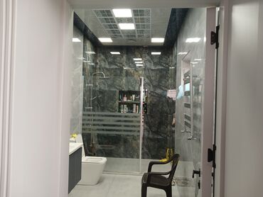 - Geniş duş zonası: şəffaf temperli şüşədən sürgülü qapılar, zolaqlı matlaşdırma ilə.