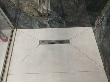 - Döşəmə drenajı: paslanməz poladdan uzun xətti trap, kafel üzərində səviyyəli quraşdırma.
