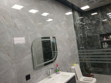 - Lavabo zonası: geniş keramika çanaq, alt dolab, kənarları işıq xətti ilə güzgü.
