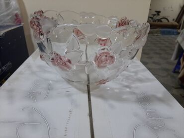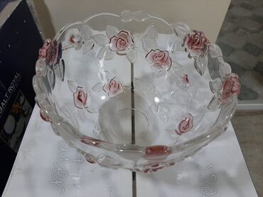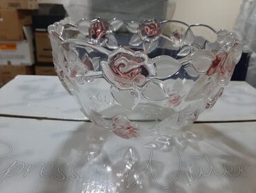 Bənövşəyi-çəhrayı tonlarda dekorativ şüşə boşqab/kandelyabr qabı. - Material: qalın, şəffaf şüşə - Dizayn: mərkəzdən dalğavari çıxıntılarla günəş/çiçək formalı; kənarlarda iri dekorativ deşikli el...