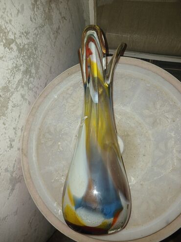 - Rəngli bədii şüşə vaza: iç-İçə sarı, mavi, ağ və qəhvəyi tonların axıntılı dizaynı, ensiz boğazlı, heykəltəraş formalı korpus; tək güllə və ya dekor kimi.