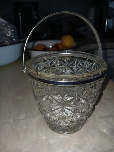 - Saplı kəsmə naxışlı şüşə qab: metal halqalı dəstəyi və metal haşiyəsi var; konfet, buz və ya xırda əşyalar üçün dekorativ qab kimi istifadə oluna bilər.