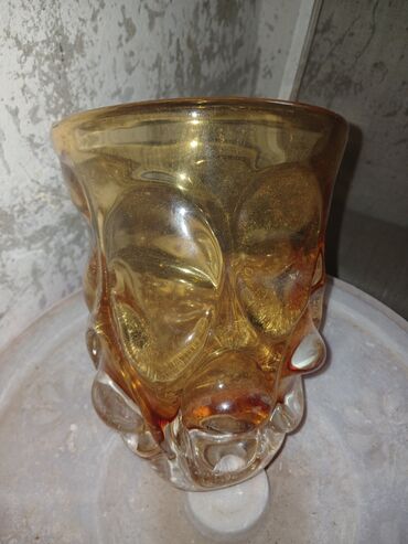 - Amber rəngli qalın şüşədən dekorativ vaza: relyefli, qabarcıq formalı səth, yuxarıdan geniş açılan ağız; masa və ya konsol üstünə dekor üçün.