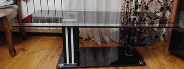 - Dizayn: Qaralı şəffaf temperli şüşə üstlük, metal bərkidicilərlə; qara parlaq baza və zolaqlı dekorativ dayaq sütunu
