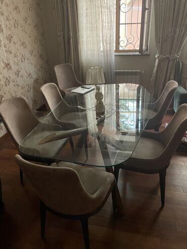 Şüşə üstlü yemək masası və 6 ədəd stul dəsti.