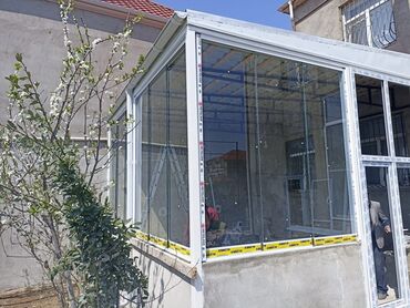 Şəkillərdə: obyekt fasadı üçün geniş vitrinlər, mənzil balkonu üçün sürüşmə şüşə sistemləri və həyət verandasının alüminium-şüşə örtülü konstruksiyası nümunələri göstərilib.