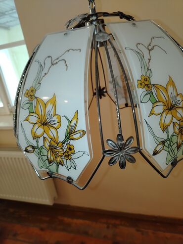 Klassik üslubda tavan lustrası - 4 lampalı konstruksiya - Şüşə plafonlar: mat-açıq rəngdə, gül naxışlı - Korpus: xrom rəngli metal, bükümlü dekorativ qollar - Asqı hissəsi və tavana bərkitmə kasas...