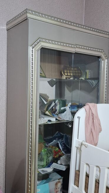 Klassik üslubda vitrin-bufet - Rəng: krem-bej, qızılı dekorlarla - Material: MDF/taxta karkas, şüşə vitrin qapıları, içəridə şüşə rəflər - Ölçü təxmini: hündürlük ~2,2–2,4 m; eni ~1,4–1,6 m; dərin...