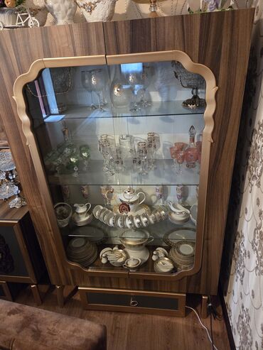 Taxta bufet-vitrin - Material: cilalanmış ağac, lak örtük - Dizayn: ön hissədə şüşəli vitrin bölmələri, dekorativ qızılı naxış işləmələri; yuxarı hissədə geniş şüşə vitrin, ortada bir qapılı taxta...