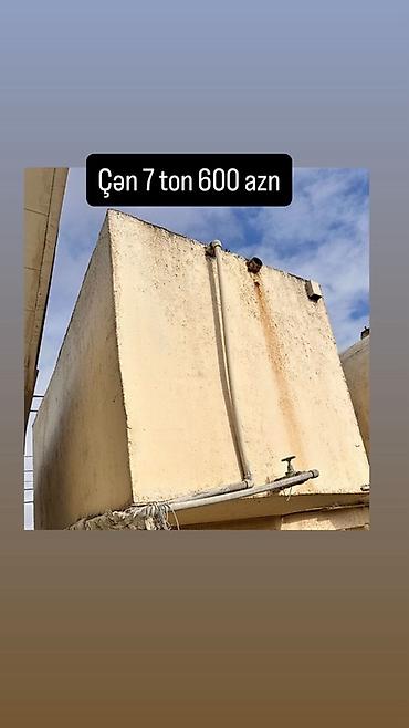- Su çəni, 7 tonluq. Kvadrat formalı, üst hissədə boru çıxışları və klapanlı xətt. Qiymət: 600 AZN.