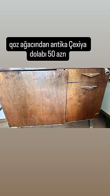- Qoz ağacından antik Çexiya dolabı. Yan-yana dolab qapıları və kiçik çekmecələr, klassik metal tutacaqlar. Qiymət: 50 AZN.