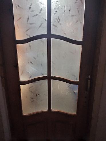 1) Təkqanad qapı – 6 hissəli mat/dekorativ naxışlı şüşə, dalğavari taxta haşiyələr, metal tutacaq və zamok yuvası