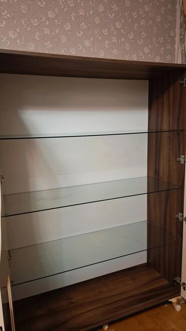 - Material: laminat korpus, şüşə qapılar və 3 ədəd qalın şüşə rəf; iç divarlar ağ və taxta naxışlı panellərlə.