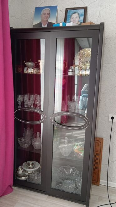 Şüşəli vitrin-dolab - Material: ağac karkas, ön hissə tünd şüşə qapılarla - Qapılar: ikili, iri dekorativ tutacaqlar; şüşə üzərində rombvari naxış - Daxili quruluş: 3 səviyyəli rəf sistemi - Üst...