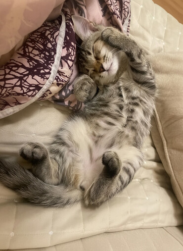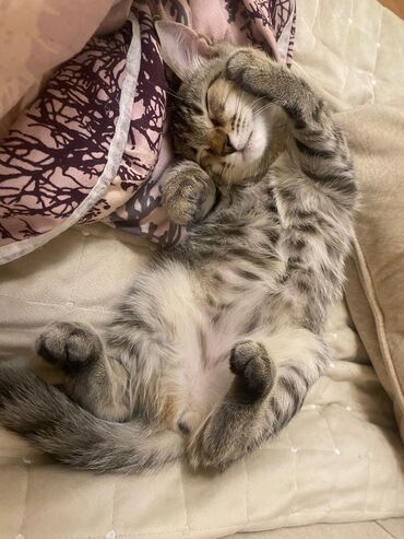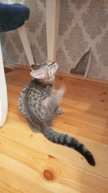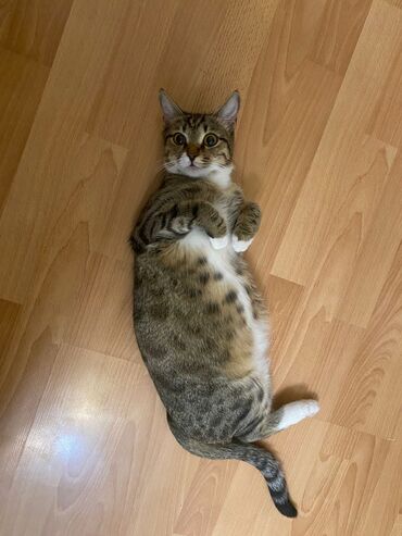 Boz-ağ rəngli ev pişiyi - Qısa tüklü, zərif və ahəngdar bədən quruluşu - Boz kürk, sinə və burun hissəsində ağ naxış, ağ pəncələr - Sarımtıl-golden gözlər, çənəaltı və bığ hissəsi ağ - Yaşıl rəngl...