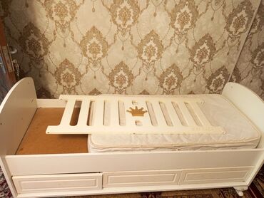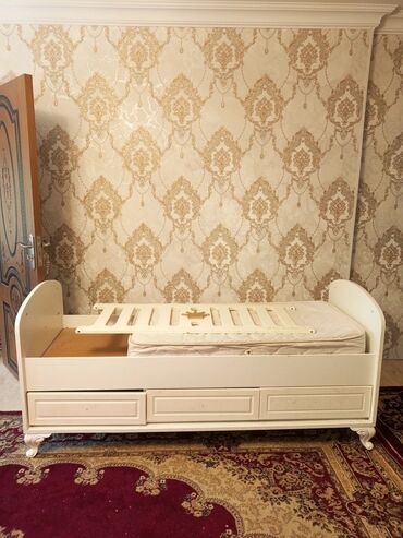 Ağ rəngdə uşaq çarpayısı, krallıq tacı bəzəyi ilə təchiz olunmuşdur. Bu çarpayı uşaq otağı üçün praktik və estetik bir seçimdir. Yataq hissəsi tənzimlənə bilən məhəccərlərlə təchiz olunub və uşağın təhlükəsizliyini təmin edir. Alt hissəsində iki geniş siyirmə var ki, bu da yataq dəstləri və ya oyuncaqlar üçün əlavə saxlama yeri yaradır. Çarpayının ayaqları oyma detallarla bəzədilmişdir. Bu model uşaq otağının interyerinə rahatlıq və zəriflik gətirir.