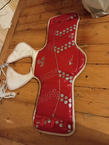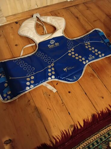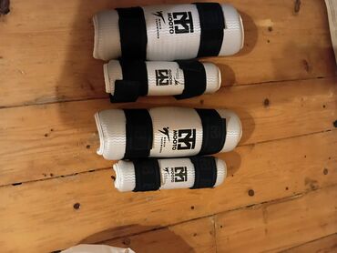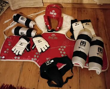 Kikboksing, taykvando idmanları üçün yarayır. Çox yaxşi vəziyyətdədi. S razmerdi. Şlem, qoruyucu qolfi, qoruyucu plastik dizliklər, Şort, 2 ədəd əl sarğısı. Komplekt çəklində satılır.