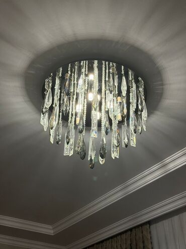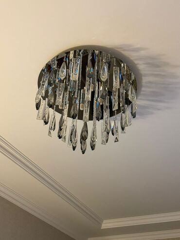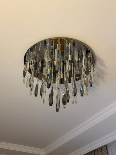 TƏCİLİ SATILIR Klassik üslubda, kristal bəzəkli tavan çilçirağı - Material: parlaq xrom rəngli metal gövdə və çoxsaylı şəffaf kristal asqılar (armud/yaş damcısı forması). - Dizayn: çoxqollu konst...