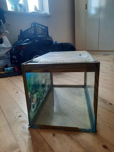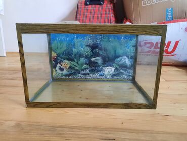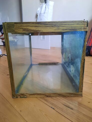 Şüşə akvarium, klassik düzbucaqlı forma. - Material: şəffaf şüşə panellər, silikon birləşmələr - Ölçü təxmini: orta həcmli (fotolara əsasən stolüstü akvarium) - Üst hissə: taxta naxışlı qapaq - Kən...