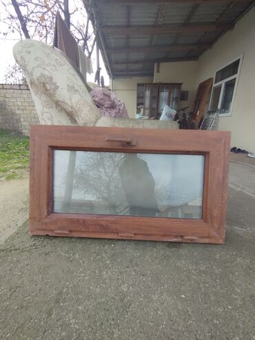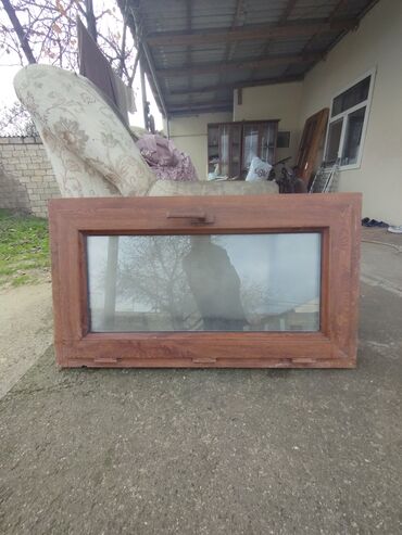 Taxta çərçivəli şüşə pəncərə qanadı - Material: təbii ağac çərçivə, şüşə vərəq - Çərçivə rəngi: laklanmış ağac tonu - Açılıb‑bağlanan mexanizm: yan tərəfdə metal dəstək və qızılı rəngli qulplar - ...