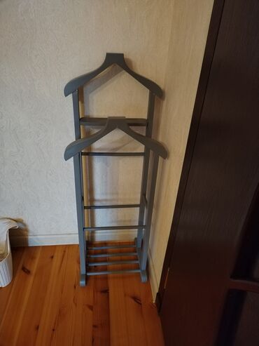 Taxta geyim askısı/valet stendi Məhsul təsviri: - Material: tam taxta konstruksiya - Rənglər: ağ, qara və təbii taxta tonları - Dizayn: iki askılı üst hissə (köynək, pencək üçün), şalvar/belbağı ü...