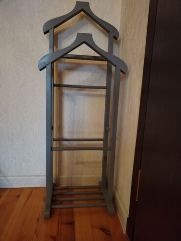 Taxta geyim dayaqları – kişi geyimləri üçün valet stendi - Material: tam taxta (şam/oxşar ağac), möhkəm konstruksiya - Üst hissə: asılqan formalı çiyinlik – pencək, köynək üçün - Orta hissə: şalva...