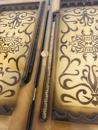 - Dəstdə taxta fişlər (şahmat daşına oxşar dairəvi naxışlı) və zərlik üçün ayrıca bölmələr mövcuddur