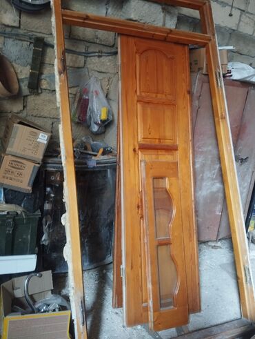 - 1 ədəd açıq rəng laklı taxta qapı, şüşəli dekor pəncərələri ilə. Qapı çərçivəsi və kilidləmə hissəsi görünür. Menteşələr mövcuddur.