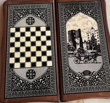 Qeyd: Dəst taxta taxta/korpusdan ibarətdir; fiqurlar və zərlərin mövcudluğu şəkillərdə göstərilənlərlə məhduddur (şəkillərdə yalnız taxta görünür). Boyalar kontrast qara-krem tonlarındadır, ornamentlər detallıdır.