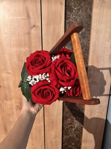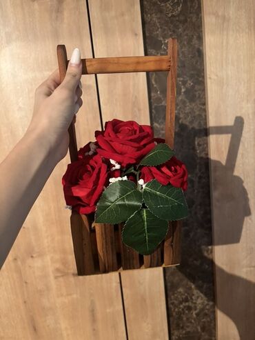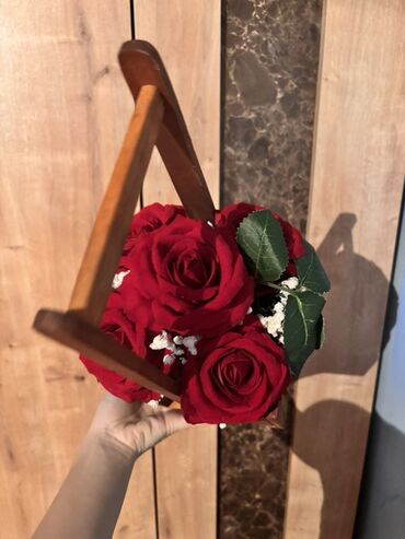 Rəngarəng dekorativ gül kompozisiyası - Kompozisiya: müxtəlif rəngli süni qızılgüllər, yaşıl yarpaqlar və bəzək elementləri ilə sıx şəkildə yığılmış buket. - Qab: ağ, teksturalı dekor vazada; üzər...