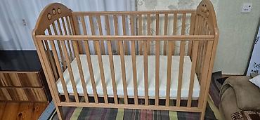 Taxta beşik – matrasla birlikdə. - Material: möhkəm ağac, təbii rəng. - Ölçü: standart uşaq beşiyi (şəkillərdəki kimi), döşək ölçüsünə uyğun. - Konstruksiya: hər iki tərəfdə sıx aralıqlı şaquli b...