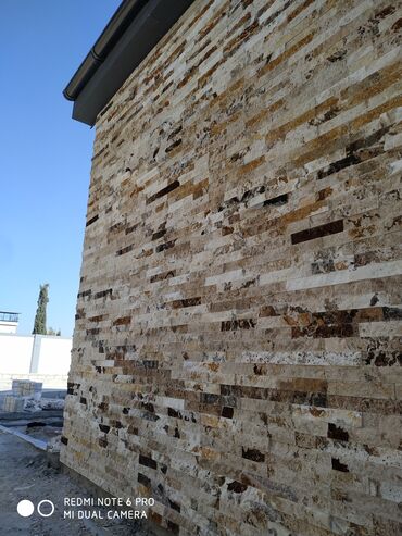 - Fasad üçün təbii daş mozaika üzlənməsi: müxtəlif bej, qəhvəyi və krem çalarlarında ensiz zolaqlı daşlar qatlama texnikası ilə divarda dekorativ tekstura effekti verir. Kənar və pəncərə ətraflarında profil keçidləri ilə işlənib.