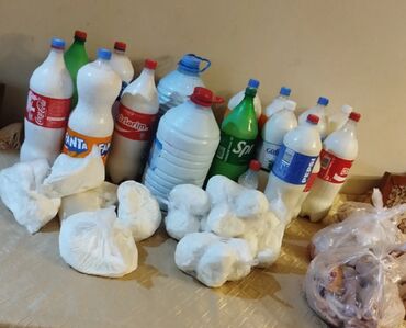 - Plastik butulkalarda (1–2L həcmli müxtəlif butulkalar) təzə inək südü və qatıq/ayran. Qapaqları möhkəm bağlanıb, müxtəlif ölçülərdədir.