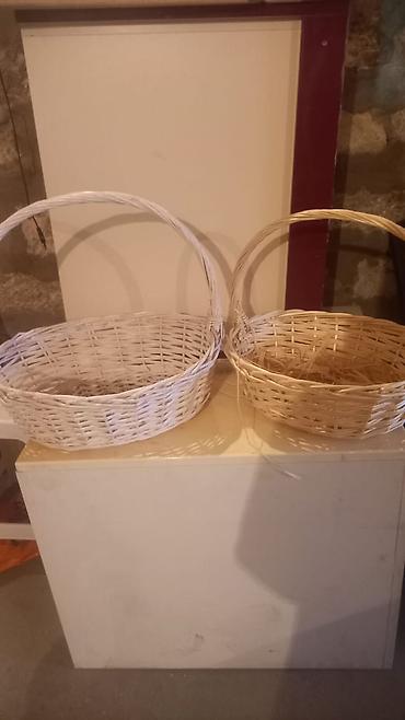 • Oval formalı, saplaqlı iki səbət – biri açıq krem, digəri ağ rəngdə. Geniş ağızlı, daşımaq üçün möhkəm qövs tutacaqla. Hədiyyə kompozisiyaları, meyvə/çörək təqdimatı, dekor və saxlanma üçün uyğundur.