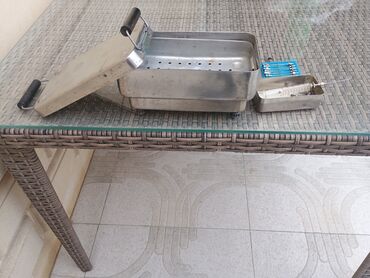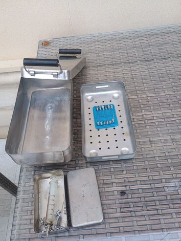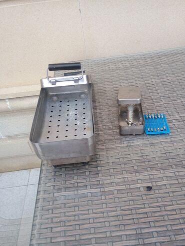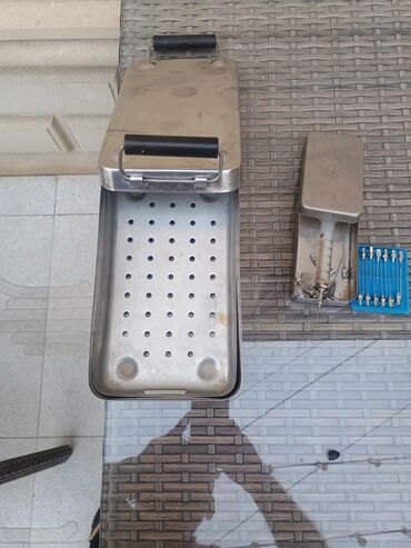 - Metal sterilizator qutusu: üzəri deşikli daxili səbət/tray, qapaqlı, yuxarıda istiliyədavamlı tutacaqlar. Alt hissədə dayaq ayaqları var.
