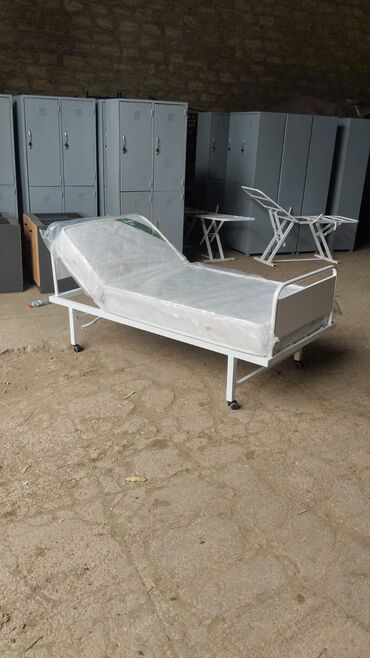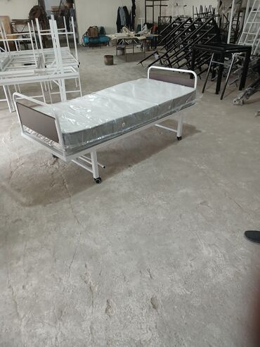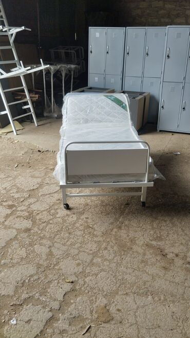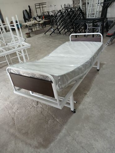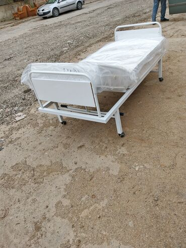 - Tək nəfərlik tibbi çarpayı: möhkəm metal karkas, ağ elektrostatik toz boya örtük. Başlıq hissəsi mexaniki şəkildə qaldırılıb-endirilə bilir (baş tərəfi yarıoturaq vəziyyətə gətirmə imkanı). Dörd təkərli baza sayəsində rahat hərəkət etdirilir; təkərlərin ikisi kilidlənir. Yanlardan matrasi saxlayan çərçivə, baş və ayaq tərəfdə metal panel. Matrass üzəri qoruyucu plyonka ilə.