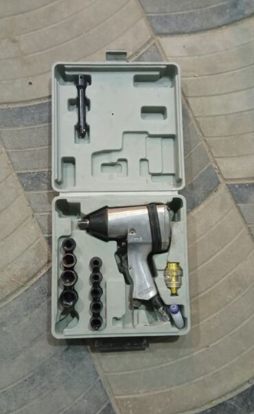 - Pnevmatik hava tapançası (udar açar) komplektdə: plastik çamadan içində; bir neçə ölçülü qara ucluqlar (qoz ucları), uzatma, hava fitinqi və yağlayıcı filtrlə birlikdə.