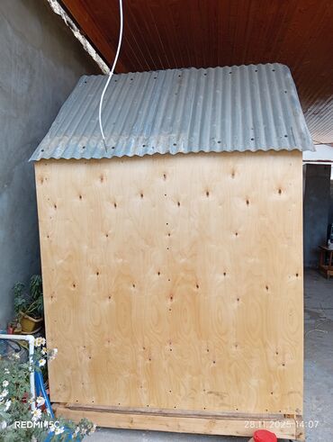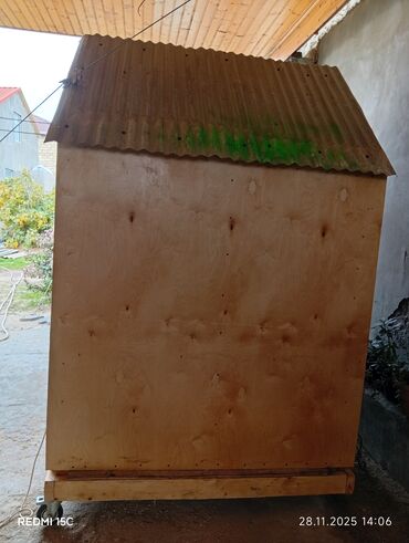 - Material: xaricdə taxta astarlı, arxa və yan səthlər kontrplak, üst örtük dalğalı şiferlə.