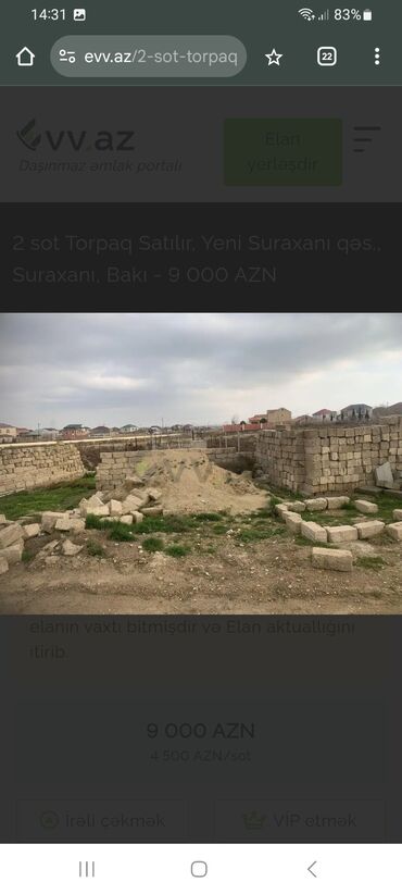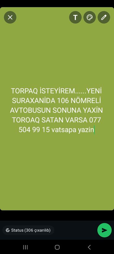 Axtarış: Yeni Suraxanı ərazisində, 106 nömrəli avtobus marşrutunun son dayanacağına yaxın torpaq sahəsi axtarıram. Ərazi həmin istiqamətdə olmalıdır. Satış üçün təklifləriniz varsa məlumat göndərin.