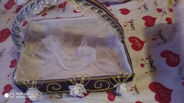 - Səbət: Düzbucaqlı forma, üstdən dantelli qulplu. Kənarları qızılı muncuq hörgüsü, üzərində qızılı lent fiqurları və ağ dekorativ güllər. İç hissə nazik tül ilə örtülüb. Xınayaxdı, nişan şirniyyatları, hədiyyə və ya gül təqdimatı üçün uyğundur.