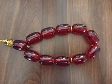 - Qırmızı təsbeh: iri, şəffaf, qırmızı oval muncuqlardan ibarətdir. Muncuqlar arasında qızılı tonlu halqa detalı, üst hissədə isə dekorativ qızılı başlıq mövcuddur. Parlaq görünüş, nümayişkaranə dizayn sevenlər üçün ideal.