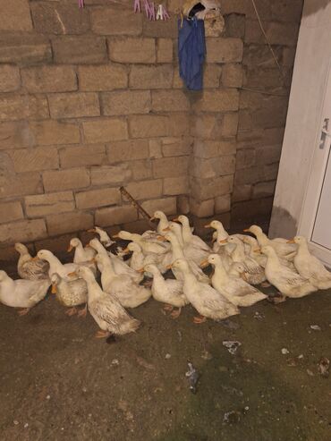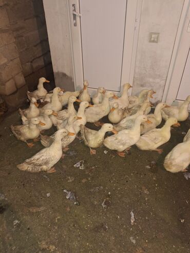 Məhsul: Ördəklər (toplu şəkildə) Təsvir: - Şəkillərdə gördüyünüz kimi, eyni partiyadan olan açıq rəngli (ağ-krem tonlu) ördəklər. - Qrup halında saxlanılıb, həyət şəraitinə uyğun. - Narıncı dimdik...