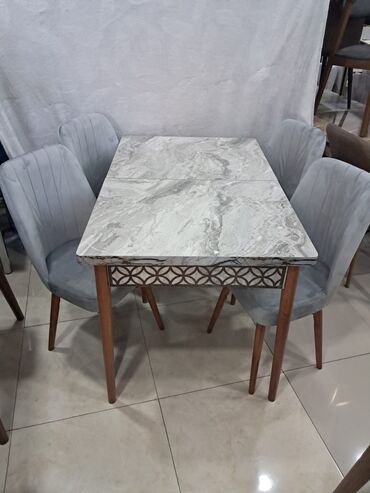 Mətbəx/Qonaq otağı dəsti – 1 masa + 4 stul - Rəng: ağ masa, neytral tonlarda yumşaq oturacaqlar (kül rəngli/boz-bej variasiyaları) - Masa forması: düzbucaqlı, yumru künclü, parlaq səth - Ayaqlar: ...