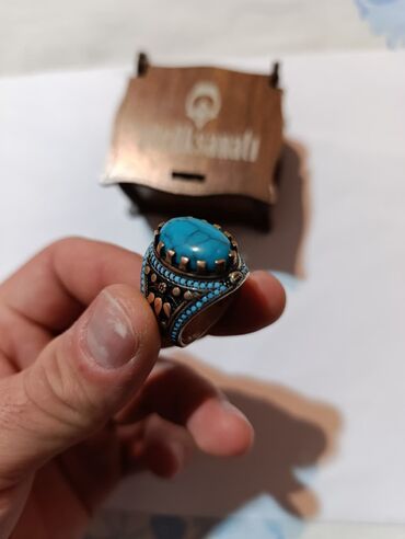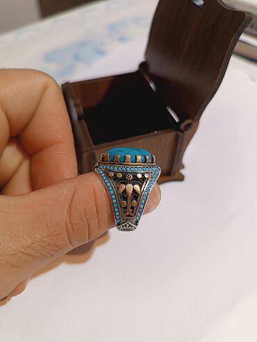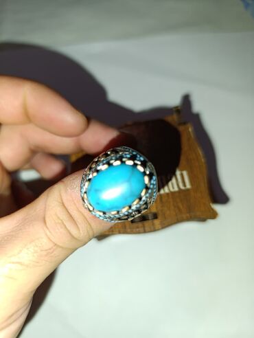 Türküzərli üzük - Material: gümüş rəngli metal korpus - Daş: iri, oval formalı mavi daş (turkuaza bənzər) - Dizayn: korpusun hər iki tərəfində və qaşın ətrafında oyma oriental naxışlar, simmetrik ...
